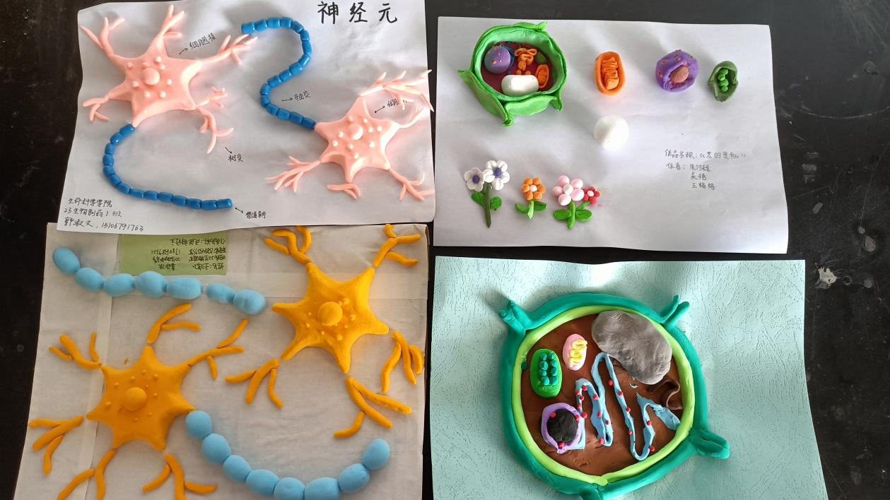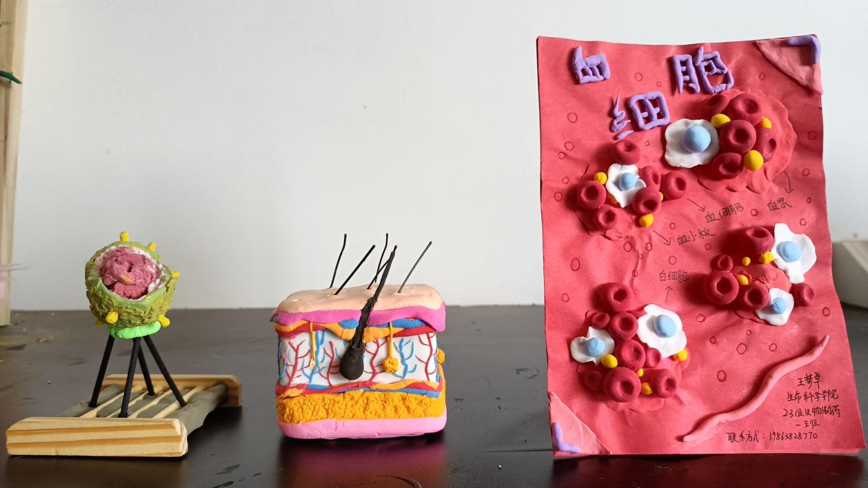 参赛选手用其独特创新力,将生活中常见的材料制作成细胞病毒组织模型;用轻黏土手工捏出各种细胞结构,加上精细的雕刻,组合搭配的效果着实令人惊艳。优秀作品中不仅有惟妙惟肖的神经元模型,活灵活现的血细胞粘土模型,还有栩栩如生的上皮组织模型。更有优者,借此机会向同学们科普艾滋病病毒流感病毒的基本结构及其传播途径。由此可见,同学们对基础专业知识的掌握之深刻,见意之深远。