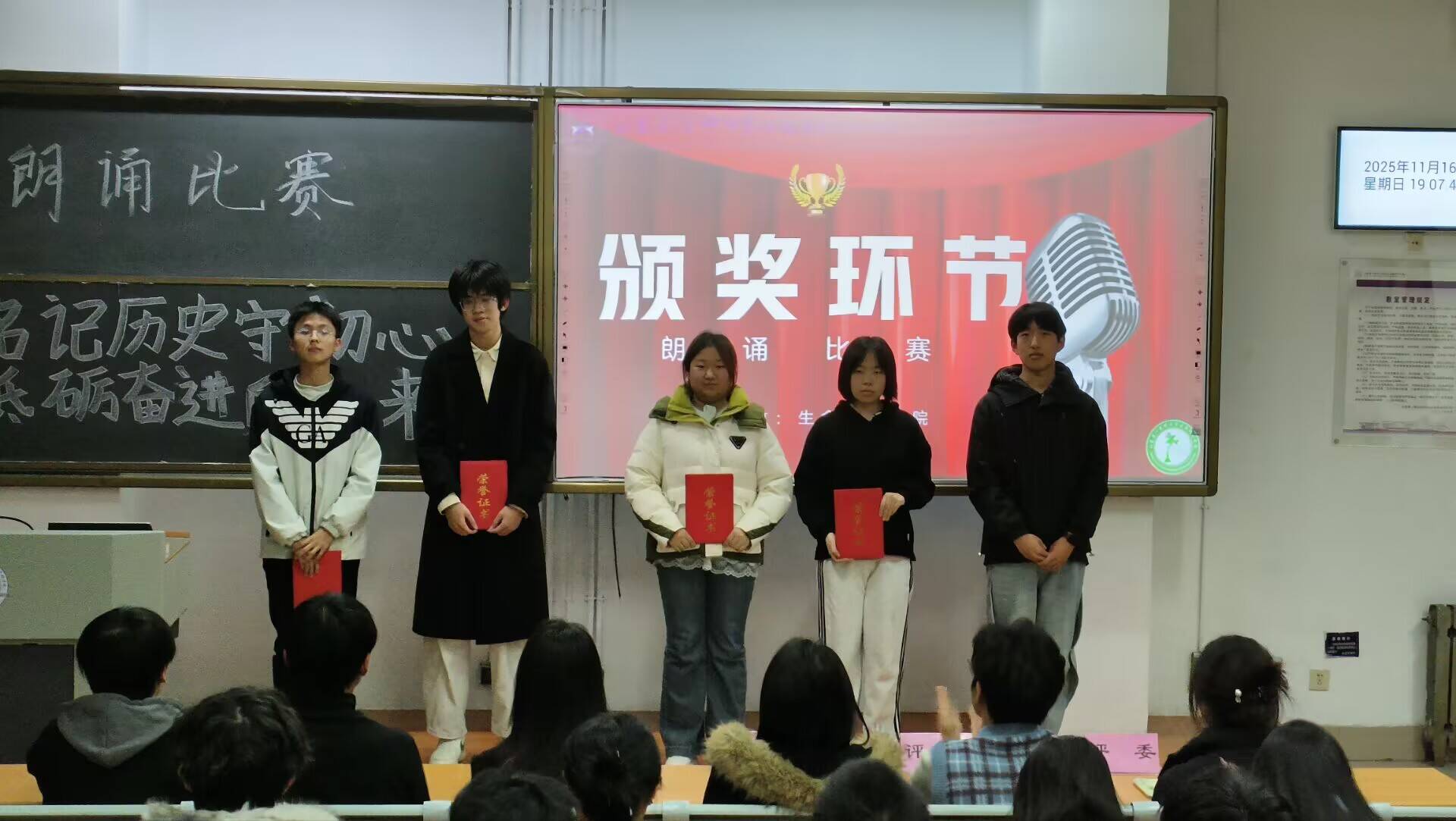 朗诵结束后,由各位评委根据选手们优秀的表现分别评选出一、二、三等奖,评委上台颁奖并合影留恋合照。台下的观众们通过这一次的朗诵比赛也更深刻地理解今天幸福生活的来之不易。往后需紧记要怀揣着对历史的敬意,不忘初心,用热忱奔赴更美好的明天。
