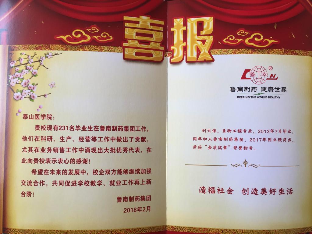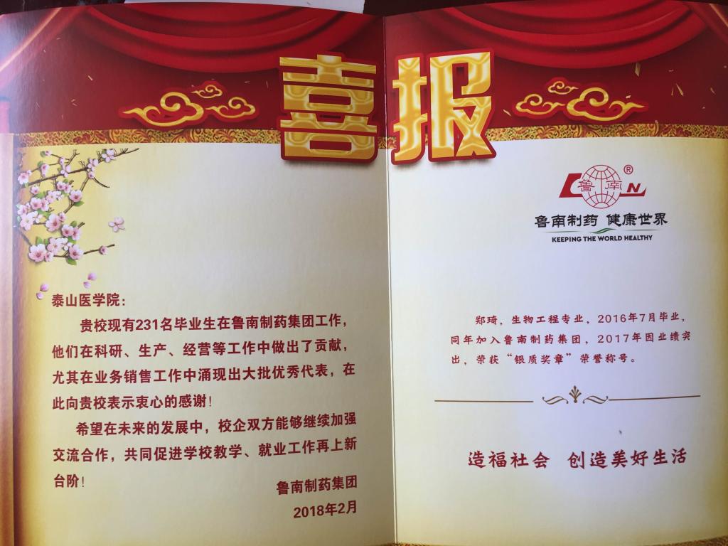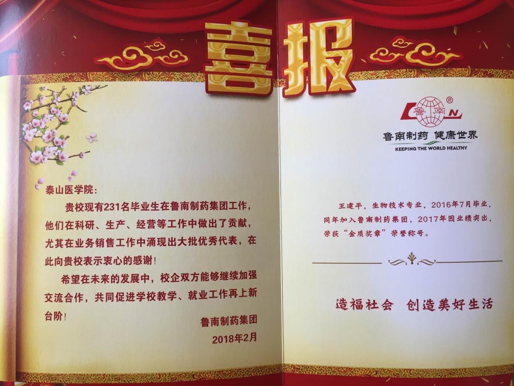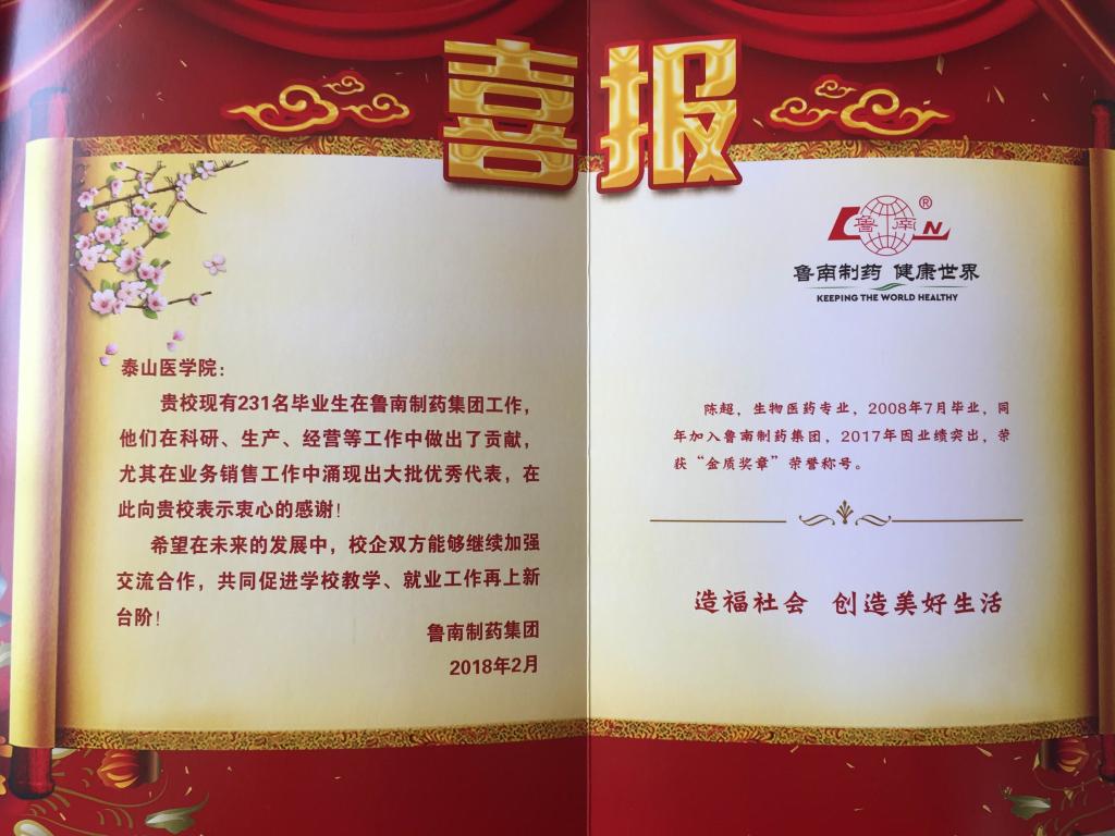 2017年陈超、刘大伟、王建平3名同学获得金质奖章,郑琦同学获得银质奖章。鲁南制药集团特发来喜报,希望在未来的发展中,校企双方继续加强交流合作,促进双方产学研再上新台阶。