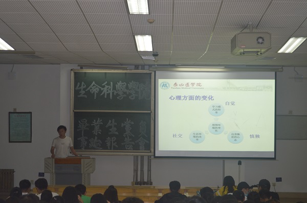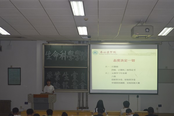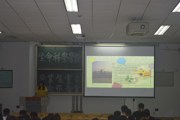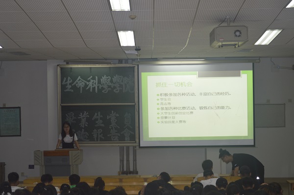 首先,生物技术专业的孙珂讲述了规划的重要性,从大学四年需要拿到的各种证书、积极参加活动等各方面详细介绍了大家四年需要努力的方向,并且分享了自己四年老员工活的感想;然后,生物技术专业的程妍用“以梦为马,随处可栖”为主题向大家分享了自己在日常学习和各种活动中的经验,提醒大家学习英语、专业课等的重要性;接着,生物工程专业的王昌浩以自己四年的经历提醒大家改变自我观念、明确自己目标以及勤奋学习的重要性;最后,生物工程专业的王娇通过自己的各种经历与经验,鼓励大家端正态度,好好规划自己未来的学习和生活,并向在座同学送上了自己的祝福。