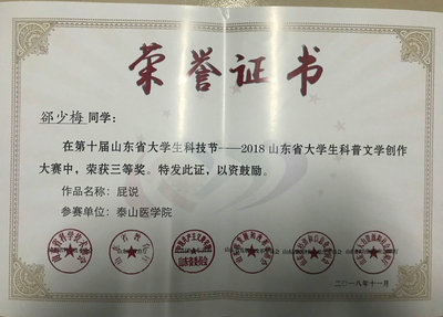 2016级生物技术专业臧丽玉的参赛作品《苍蝇为啥不生病》荣获一等奖;2017级生物制药李晓楠、郤少梅的参赛作品《蚂蚁力士》等荣获三等奖。