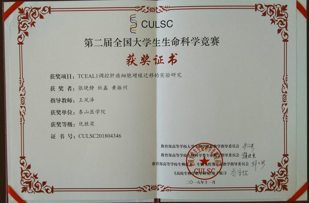 本次比赛从三月份开始报名,经初赛、网评、山东省省赛等层层选拔,在省赛中张晓静、黄振州、杜鑫的参赛作品《TCEAL1调控肝癌细胞增殖迁移的实验研究》荣获一等奖;刘万才、王鹿宁、徐士林的参赛作品《CP466722对乳腺癌细胞的凋亡和自噬的影响》荣获二等奖。陆云彪、王盈桐、李学威、刘晓东等同学的参赛作品《牦牛酸奶酪中高产乳糖酶菌株分离鉴定及其酶学性质》荣获三等奖。经推荐,一等奖作品《TCEAL1调控肝癌细胞增殖迁移的实验研究》获批参加国赛。