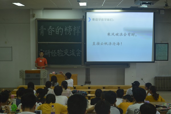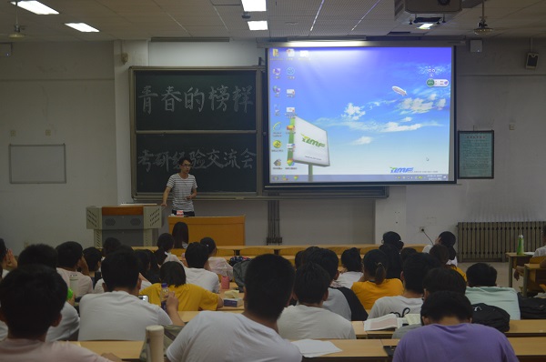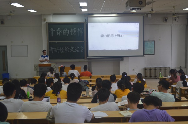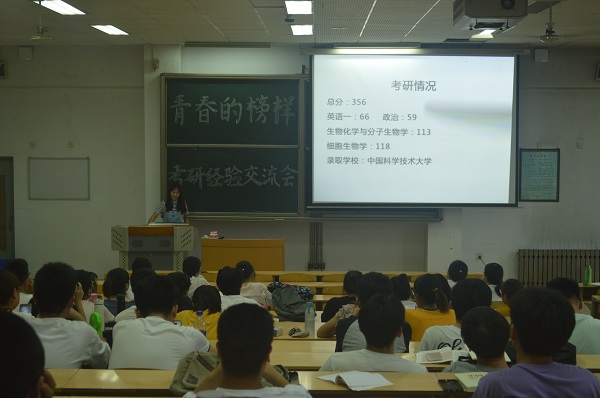 为了让2016级同学更加了解本专业考研的相关知识,知晓最新考研动态,提高考研热情,6月21日晚,生科院于教学南楼C3002举办考研经验交流会。本次交流会邀请考入中国科学技术大学、海军军医(原第二军医)大学、华中科技大学、山东大学、中南大学、苏州大学、扬州大学的毕业生向同学们分享有关考研的经历经验,2016级全体同学参加了本次交流会。