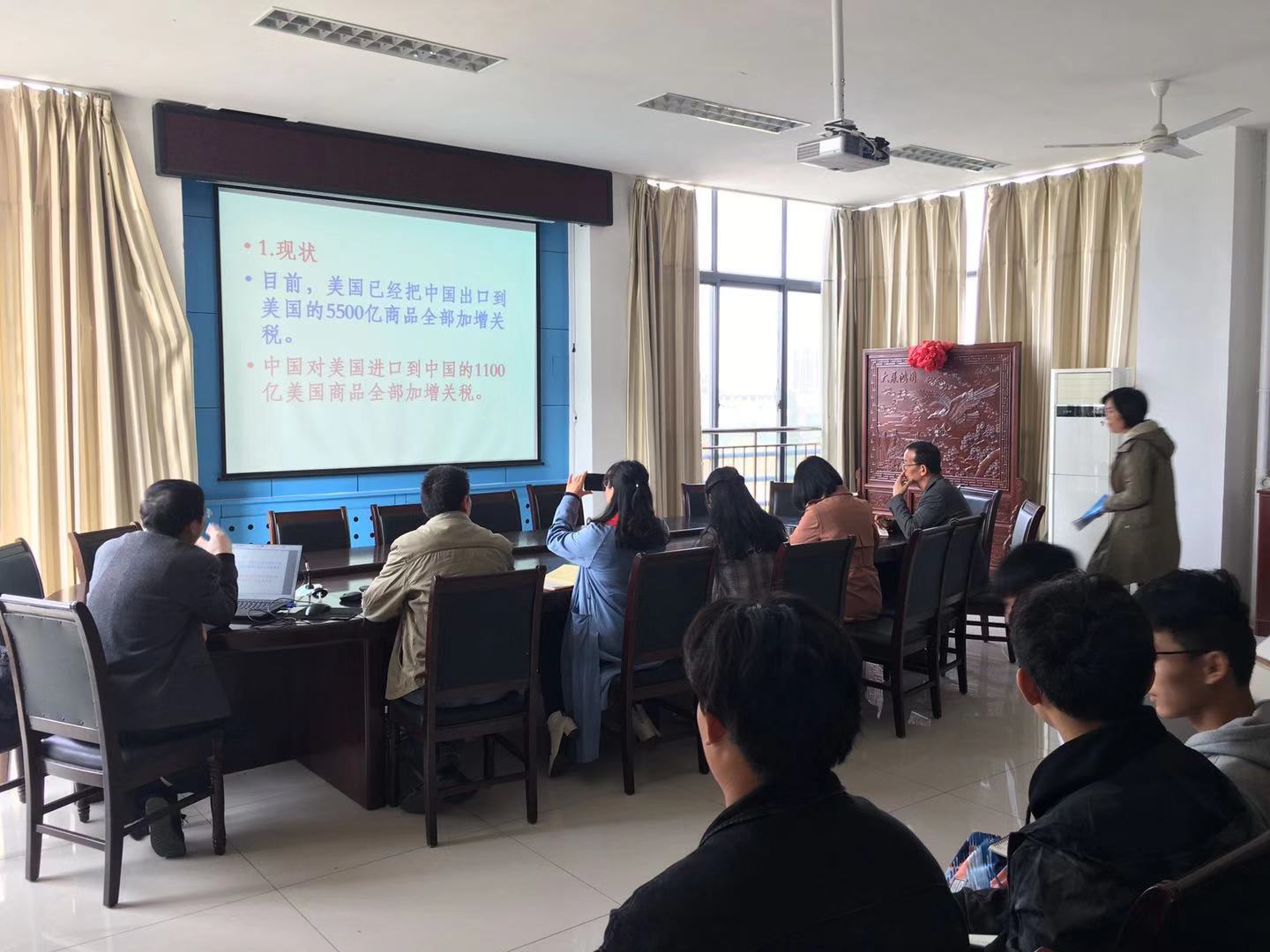 任冲教授以“当前我们面临的国际形势”为题,主要从两个方面展开讲座,一是当前中美贸易形势,二是香港局势问题。首先,任教授从中美贸易摩擦焦点、贸易关税、本质、发展趋势、战略五大方面对中美贸易形势进行了全面分析,其中讲到:战略性补贴问题和结构性改革是我们的底线,是不能谈的,其他一些问题如大豆贸易等问题是可以谈的,中美贸易摩擦的本质是意识形态在贸易领域的体现,是美国阻止中国发展的体现,并指出中美贸易摩擦将是一项长期的、重大的战略博弈,中国政府要做好准备迎接任何挑战,坚决捍卫国家核心利益和人民的根本利益。随后,任冲教授从香港问题的起源、中央的态度立场、趋势判断与初步建议四个方面进行了阐述。香港是中国不可分割的一部分,中国必须坚持一国两制政策,集中精力解决香港问题,还香港一片和平的蓝天。