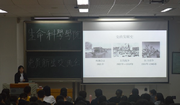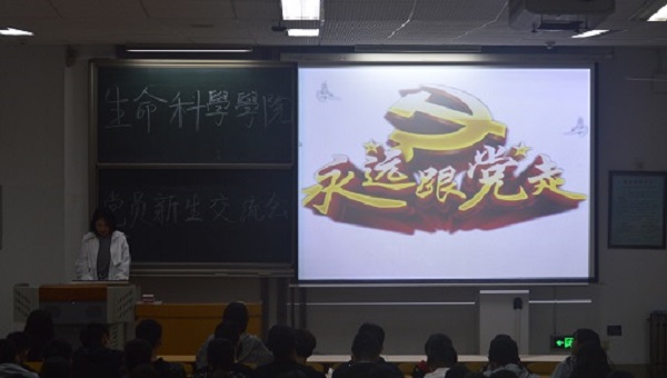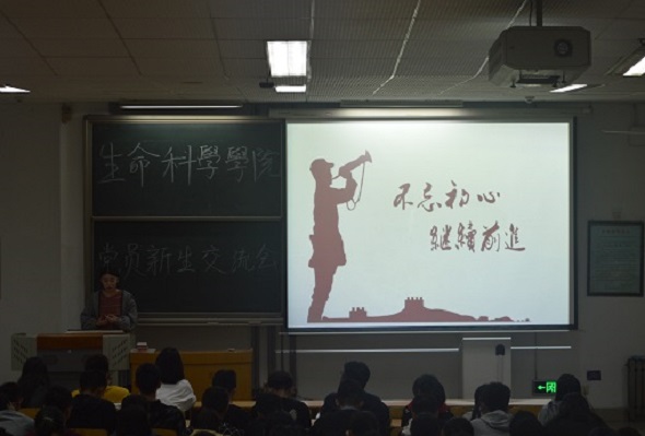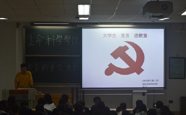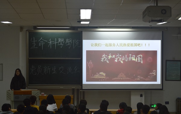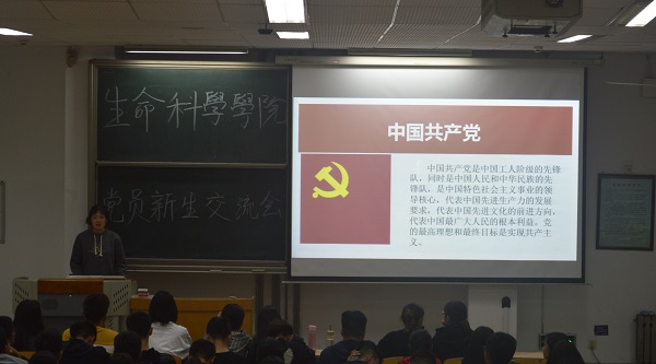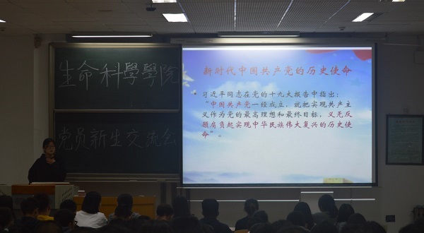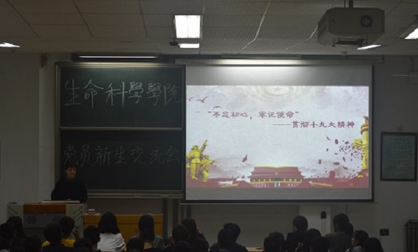 2019年10月18日晚,生科院开展“不忘初心、牢记使命”员工党员与新生思想交流会。周笑寒、张海陆、吴雨晴、武智悦、张孟、李欣、吕雪茹、孟子育八位员工党员及2019级全体新生参加了此次会议。