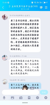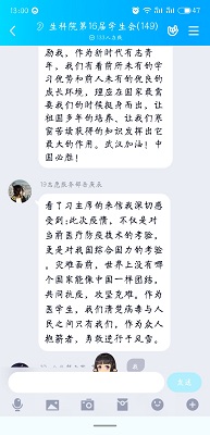 医学的进步离不开生命科学的发展,无论从疾病模式生物的建立,还是疾病快速诊断技术的应用,乃至疾病生物治疗的推广和生物药物的研发,无不是在生命科学技术不断进步的前提下取得的。此次线上学习及讨论活动,进一步增强了生科院同学们的专业认同感,提高了员工学习的专业使命感,更加坚定了同学们努力奋斗、学习科技知识的信心。我们坚信,中国会好起来,最美逆行者们也一定会平安归来。中国,加油!