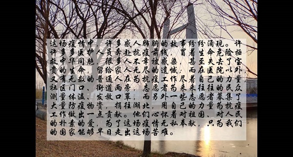 本次活动以“爱国、青春、奉献”为主题,通过线上征集作品,并由生科院员工会和活动负责人对征集的三十余份作品进行评选。参赛同学们把疫情中的所见、所闻、所想作为内容,通过抑扬顿挫的语言,表达出内心真实的情感,他们或慷慨激昂、或婉转深沉,充分抒发了心中对奋战在抗疫一线人员的敬佩和将来建设美丽祖国的决心。通过评选,赵炜炜和宗浩然的作品体现出对青春的思考,完美地展现出了当代青年的责任担当,荣获一等奖;胡海若、张昱等同学的作品凭借生动的形象、清晰的逻辑,获得二等奖;杨静、朱润生、周晓爽等同学的作品独具特色,蕴含着深刻的意义,获得三等奖。
