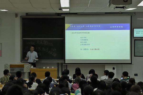 最后,团总支书记刘兆玺对新生的到来表示热烈欢迎,从考研、就业等方面阐述了上大学的目的与学习的重要性,引用名言故事告诫同学们大学不是舒适圈,诠释了“知识改变命运”的道理。并详细介绍了生科院四个省级优秀社团和协会各自的成立时间、协会特色、社团活动等,鼓励同学们按照自己的兴趣积极参与社团,为未来积累实验技能、培育个人能力。
