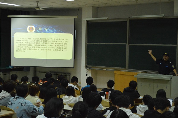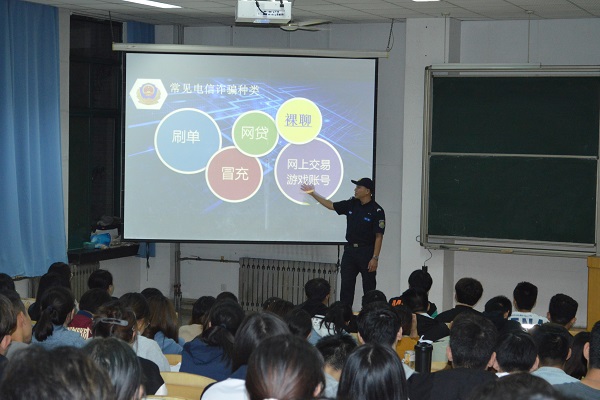 龙泉派出所的马涛警官首先从电信诈骗的定义出发,围绕电信诈骗范围及常见形式,以及防范电信诈骗的方式方法等进行了全面分析讲解。他强调目前电信诈骗的范围涵盖广、手段翻新速度快、诈骗金额高,并且是以犯罪团伙进行有组织、有预谋地进行诈骗。因此,为预防诈骗应做到“给钱不要,要钱不给”,不轻信来历不明的电话、短信,不轻易透露自己的身份和银行卡的信息。警官同志还结合办案经历,分析了诸多发生在校园的真实案例,重点讲解了案发率较高的诈骗方式及案件处理方式。