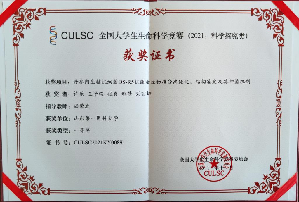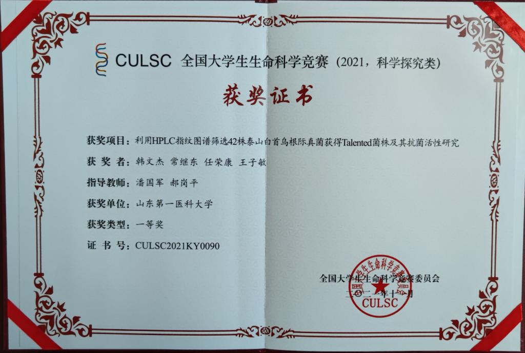 项目组成员和指导教师经过历时近10个多月的备赛,经过设计实验、实践实验、数据记录、论文撰写、网络评审等环节,取得了丰硕成果。他们凭借良好的科研素养和综合能力,精彩地展示了项目内容和研究成果,获得了专家评委们的一致肯定。最终,由潘国军和郝岗平老师指导,韩文杰、王子敏、常继东、任荣康四位同学完成的参赛项目《利用HPLC指纹图谱筛选42株泰山白首乌根际真菌获得Talented菌株及其抗菌活性研究》,由洒荣波老师指导,许乐、王子强、张爽、邢倩、王丽娜五位同学的参赛项目《丹参内生拮抗细菌DS-R5抗菌活性物质分离纯化、结构鉴定及其抑菌机制》,均获一等奖。
