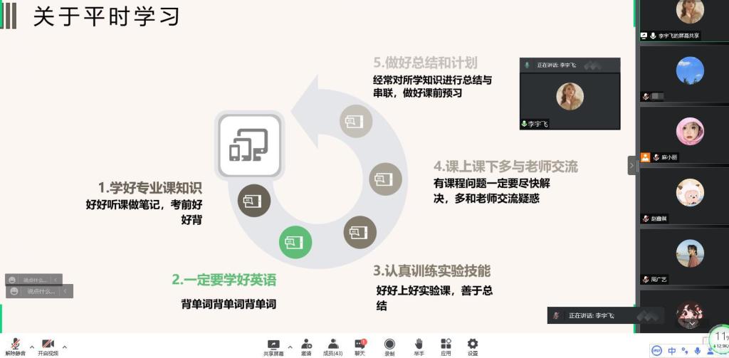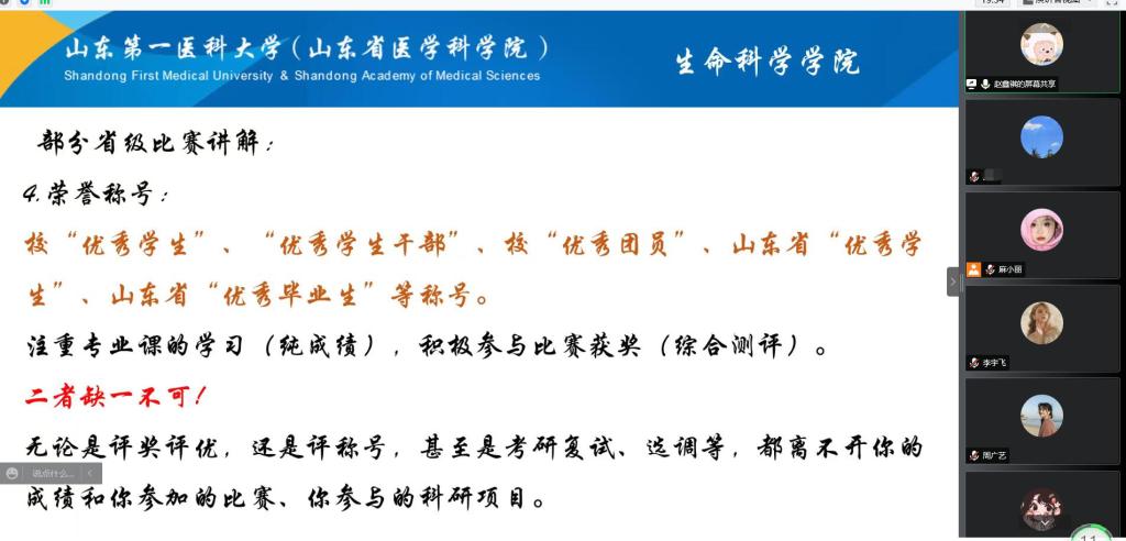 会议邀请了2018级优秀员工代表赵鑫祺、李宇飞同学做成功经验分享。赵鑫祺结合自己考取选调生的成功经历,向在线的师生们非常细致地分享了自己大学的学习、研究成长经历、选调的规划以及面试过程中的建议。考入中国科公司大学的李宇飞同学从平时学习、如何开展科研、考研备考等学业方面做了详细介绍。两位主讲人在校期间刻苦努力,常年获一等奖学金,曾获国家级、省级奖励奖近20项。赵鑫祺同学获得山东省“优秀员工”、山东省“优秀毕业生”等称号。李宇飞同学曾获国家奖学金,全国飞“young”奖学金,发表多篇中英文文章,参与获批专利2项。