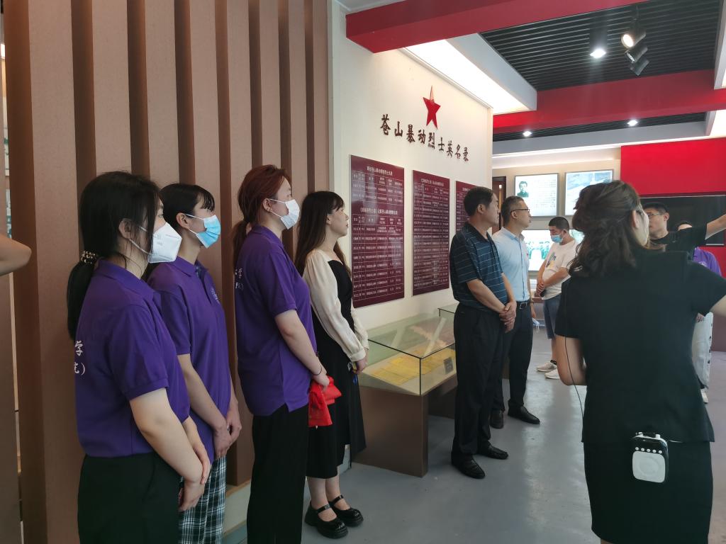 随后,志愿者来到苍山暴动纪念馆,追寻红色足迹汲取信念之钙。在讲解员声情并茂的带领下,大家仿佛回到了那段硝烟四起的岁月,前辈们在艰苦卓绝的条件中斗争,在敌人的追捕中浴火重生。在一件件带有岁月痕迹的物品上,团队师生更加深刻的体会到了,革命先烈为我们开辟如今幸福生活的每一步的沉重积淀。“为有牺牲多壮志,敢教日月换新天”,革命先烈是民族的脊梁,国家的先锋,其三功伟绩永垂不朽,其浩然之气万古长存。师生们更加深刻地领悟了伟大的革命精神,意识到了新时代青年的责任与担当,并立志要牢牢把握革命精神的时代内涵,在新的百年历程中不忘初心,砥砺前行,努力成长为与祖国共振,与时代同频的新时代青年。
