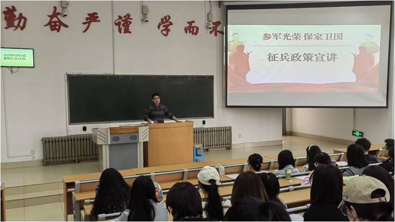 张岳详细介绍了2023年征兵的相应政策,征兵对象、征兵时间、征兵意义等作出详细讲解,鼓励同学们积极应征入伍,为国防事业贡献出新时代中国青年的青春力量。随后,王蕴含向同学们解释了国防的意义——“军强则国强,国强则民安”,强调国防事业对于国家的重要程度,树立起正确的国防思想,并就应征入伍的一些基本流程以及常见问题进行了分析与解答,使同学们对相关政策得到充分了解,激发同学们对于报国参军的热情。