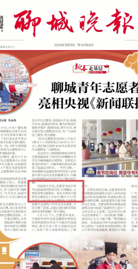 与此同时,张东方同学参与的志愿服务活动,先后受到临清共青团、聊城共青团、山东青年志愿者等官方公众号以及《临清新闻》、《聊城晚报》、齐鲁电视台、央视《新闻联播》等媒体的关注和报道。