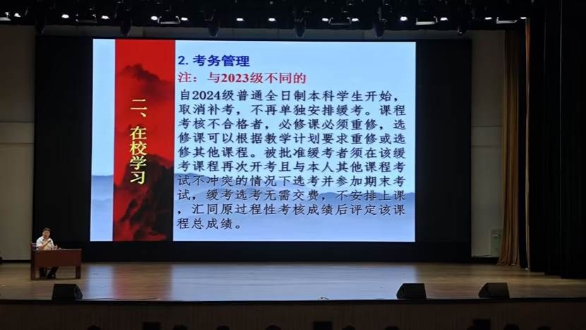 张燕堂老师深入浅出地为新生们讲解大学的教学管理模式。从课程安排的科学性到考核评价的多元化,让新生对大学学业有了清晰认知。同时,详细介绍了选课系统的操作方法和注意事项,确保新生能够顺利选到心仪的课程。最后通过介绍学业警告来约束新生们的日常活动,告诫新生要坚守诚信底线,杜绝作弊等不良行为。新生们认真聆听,纷纷表示对大学的学习生活充满期待。
