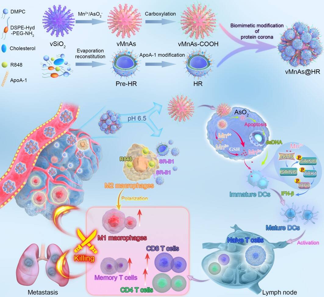 鉴于此,mkmksport王昌龙教授课题组创新性地发展了一种可拆卸高密度脂蛋白(HDL)修饰的病毒样锰砷药物制剂,以实现安全靶向递送和协同砷治疗。利用HDL形成的蛋白冠对病毒样锰砷颗粒的尖状表面进行动态屏蔽,可以避免吸收其他无用蛋白,并利用HDL与其受体SR-B1之间的相互作用,提高肿瘤靶向递送。在肿瘤酸性微环境中,pH响应的HDL蛋白冠从病毒样颗粒表面解离并与巨噬细胞相互作用,促进M2型巨噬细胞向M1型极化。重新暴露的病毒样颗粒被肿瘤细胞有效内吞并诱导细胞凋亡,同时释放双链DNA(dsDNA)和锰离子,共同激活树突状细胞(DCs)中cGAS-STING信号通路。M1型巨噬细胞的极化和DCs的激活共同逆转了免疫抑制微环境,引发了有效的抗肿瘤免疫治疗。本工作为砷靶向递送和疾病高效诊疗提供了新的策略。