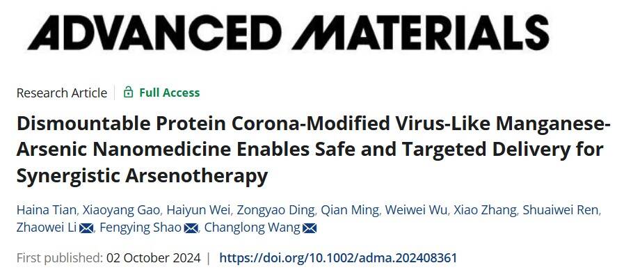 近日,mk体育王昌龙教授团队在《Advanced Materials》杂志(IF=27.4)上发表题为“Dismountable Protein Corona-Modified Virus-Like Manganese-Arsenic Nanomedicine Enables Safe and Targeted Delivery for Synergistic Arsenotherapy”的研究论文。课题组博士后田海娜为本论文第一作者,王昌龙教授,邵凤英副教授和李照伟副教授为本论文通讯作者,mk体育为第一完成单位。