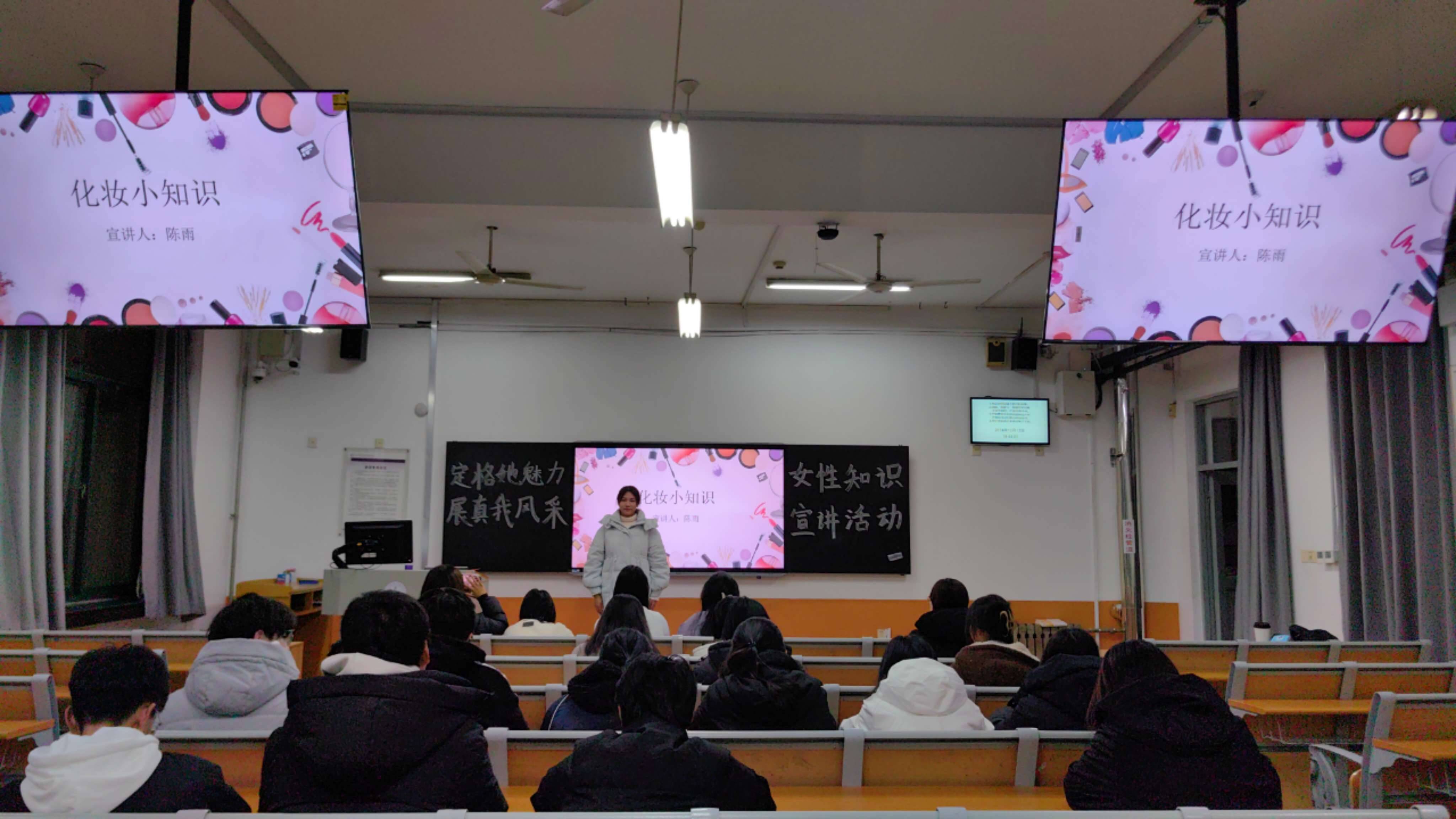 由主持人宣布活动开始,由女生部的五位宣讲人分别向同学分享了女性成长的书籍、女性成长的话题、化妆知识和健康知识五个方面,从这五个方面向群众诠释了女性力量的内涵,传播女性精神。