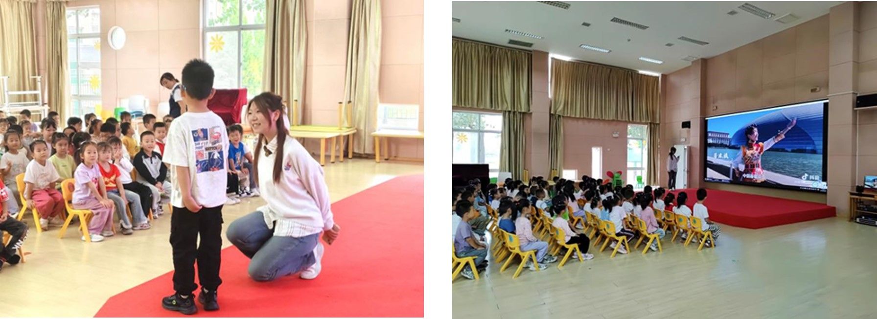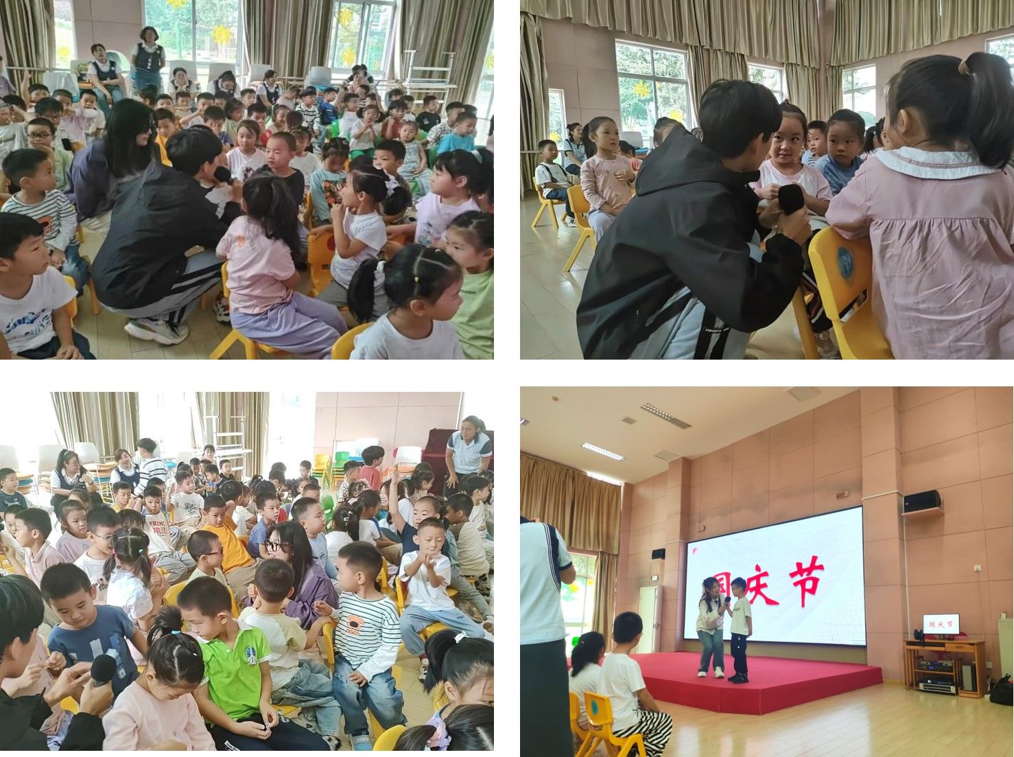 活动中,志愿者张琬钰首先以提问的方式引出即将到来的国庆节,向小朋友们介绍了这一重要节日的意义,并通过展示国庆节时挂满灯笼和彩旗的场景,让小朋友们感受到节日的氛围。接着,张琬钰又询问小朋友们我国的民族数量,引出了我国 56 个民族各自独特的文化和传统,并通过小游戏让小朋友们辨别屏幕上的美食所属民族,感受不同民族的魅力,强调大家要相亲相爱、互相帮助。